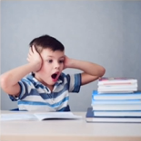②:He's looking at his homework.(他正在看自己的家庭作业。 | その男は今自分の宿題を見ています。)